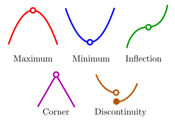 For analyzing a function, it's very efficient to have a look at its Critical points, which could be classified as Extrema, Inflection, Corner, and Discontinuity.